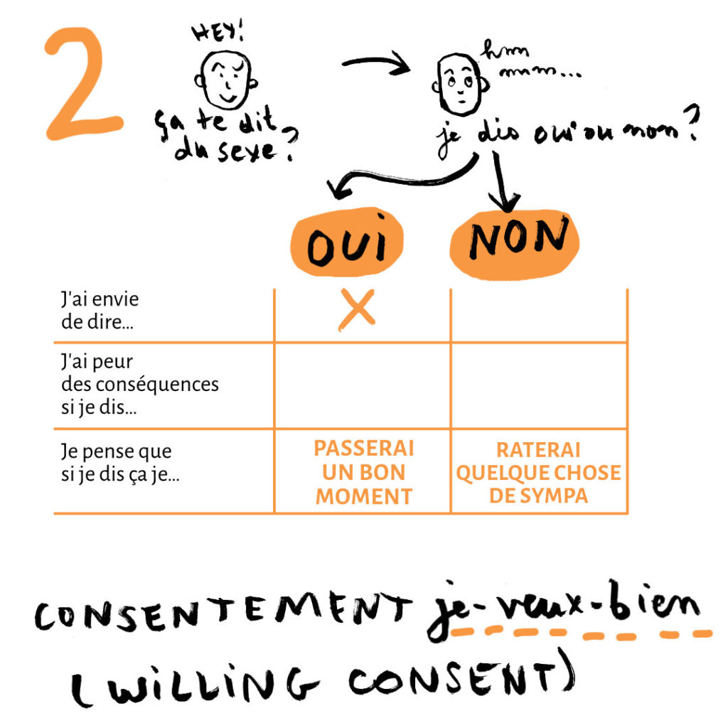 Ensuite, le “willing consent”, que nous appellerons “le consentement je-veux-bien” (à défaut d’une meilleure traduction !). Vous ne ressentez pas de désir, ou d’attirance sexuelle, mais vous pensez que si vous acceptez, vous passerez un bon moment, et/ou que le désir va se réveiller. Un exemple : vous êtes asexuel·le mais vous aimez le sexe avec un·e partenaire pour l’intimité du moment ou pour le plaisir physique ressenti. Autre exemple : vous n’êtes pas excité·e là maintenant, mais vous avez envie de l’être.