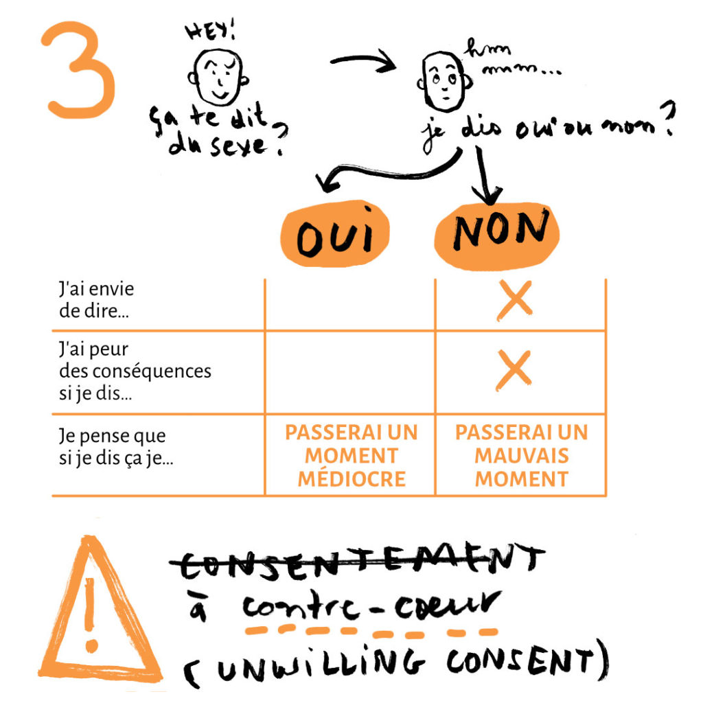 Troisième catégorie, qui ne constitue plus du consentement, mais qui prend en compte les raisons qui poussent quelqu’un·e a accepter du sexe sans en avoir envie : le “unwilling consent” (le consentement à contre-cœur). Vous dites oui, mais parce que vous pensez que les conséquences d’un refus seront pire que celles d’un acquiescement. Dire oui ce n’est pas terrible, mais dire non encore moins. Autrement dit, vous avez dit oui “pour avoir la paix”.