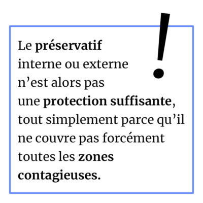 Elle peut être transmise par une personne asymptomatique, ou par une personne symptomatique en dehors des périodes de poussées. Pendant les périodes d’activité du virus, elle se transmet malheureusement très facilement par simple contact. Le préservatif interne ou externe n’est alors pas une protection suffisante, tout simplement parce qu’il ne couvre pas forcément toutes les zones contagieuses. En cas de crise, il est donc conseillé d’éviter tout contact direct avec la zone où le virus est actif. Ça veut dire éviter les pratiques comme la pénétration anale et vaginale ainsi que le sexe oral. Il faut donc faire preuve d’imagination pour conserver une sexualité pendant les épisodes d’herpès ! On peut utiliser des gants, des sex-toys (propres), des digues dentaires, ou jouer d’avantage sur la sensualité (massages, bisous…), ou encore pratiquer le sexe à distance.